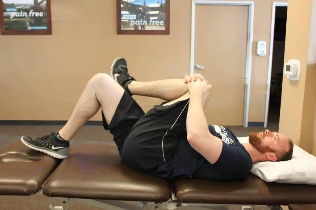 - Pokrčte jednu nohu a pomalu ji přitáhněte k opačnému rameni – například pravé koleno přitáhněte k levému rameni.