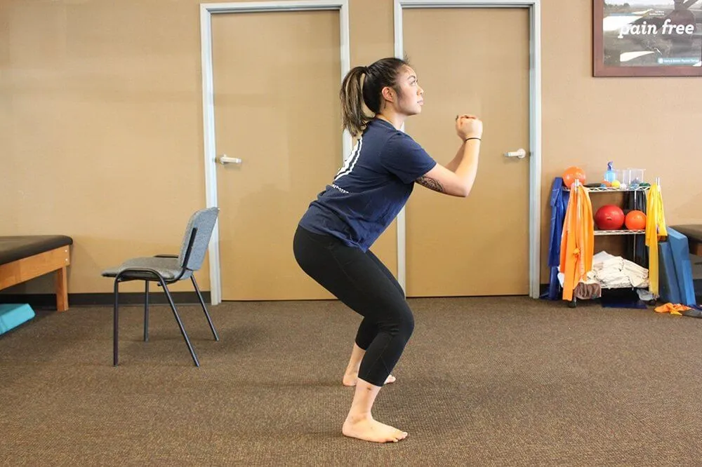- Pomalu spouštějte boky dolů, jako byste si chtěli sednout na židli.