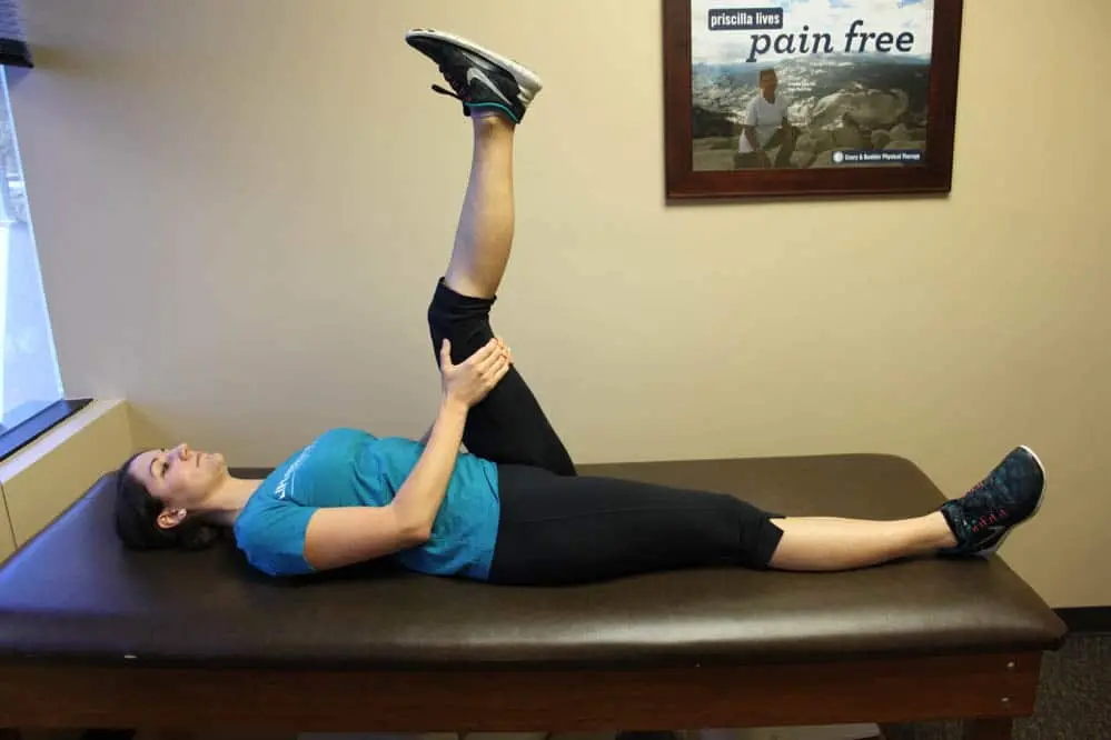 - Uchopte zadní stranu stehna nebo lýtka a přitahujte nohu k sobě, dokud neucítíte jemné napětí.