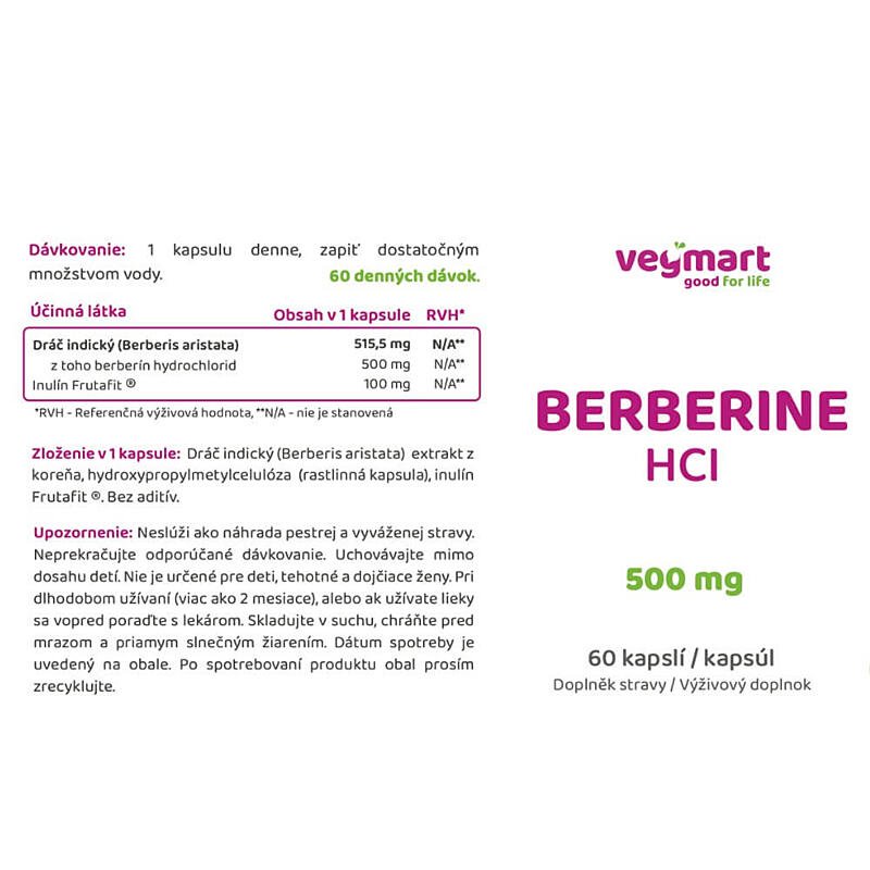 Vegmart přináší berberin v podobě praktických kapslí. Každá kapsle obsahuje 515,5 mg extraktu z kořene dřišťálu, standardizovaného na 500 mg berberin hydrochloridu.