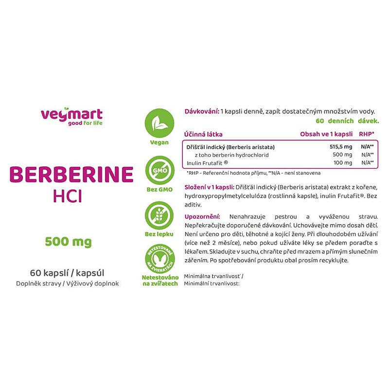 Berberine HCL je doplněk stravy z portfolia naší značky Vegmart. Naší filozofií je nabízet vám čisté, 100% veganské doplňky stravy z kvalitních surovin a s vysokým obsahem účinných látek, bez zbytečných aditiv. Vegmart – good for life.