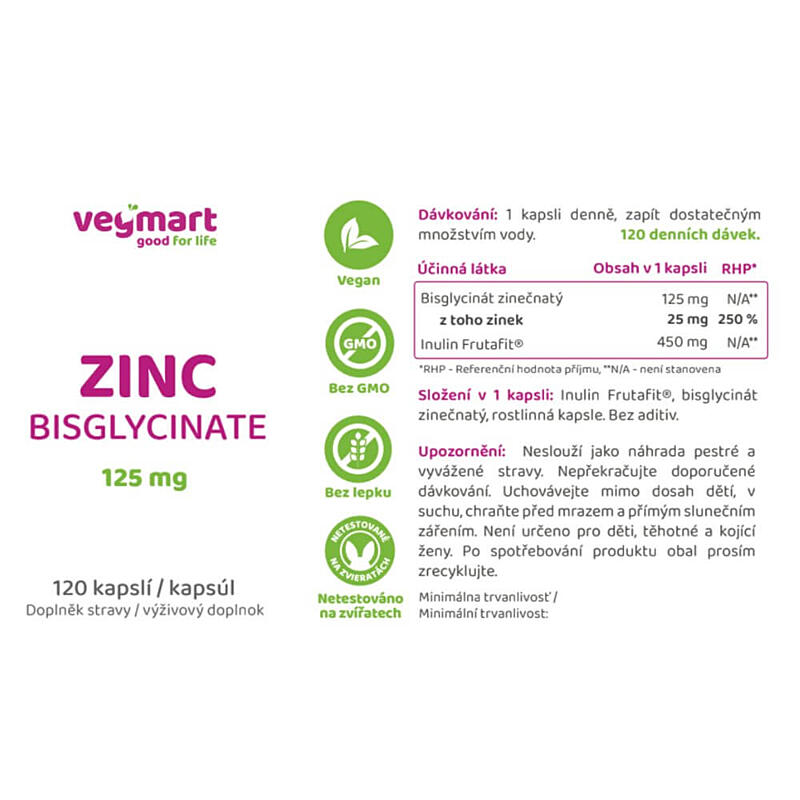 Zinek Bisglycinát 125 mg, 120 kapslí je doplněk stravy z portfolia naší značky Vegmart. Nabízíme vám čisté, 100% veganské doplňky výživy z kvalitních surovin a vysokým obsahem účinných látek, bez zbytečných aditiv. Vegmart - good for life.