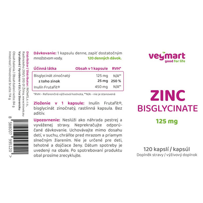 Inulin Frutafit®, bisglycinát zinečnatý, hydroxypropylmethylcelulóza (rostlinná kapsle). Bez aditiv.